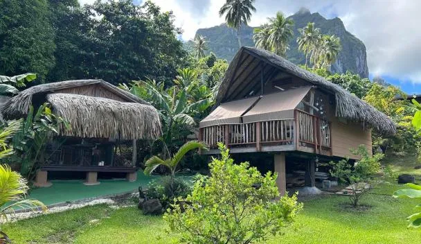 Die Unterkunft Tiki Ora Lodge - TIKI, die über einen Außenpool, einen Garten und eine Terrasse verfügt, bietet Übernachtungsmöglichkeiten in Bora Bora mit kostenlosem WLAN und Bergblick.