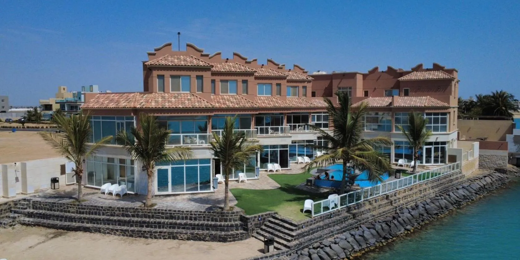 Το للعائلات - Blue شاليهات είναι σε Durat Alarous και έχει κλιματιζόμενα δωμάτια, ιδιωτική πισίνα, θέα στη θάλασσα και αυλή.