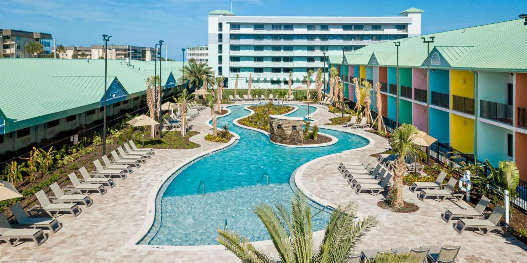 Located in Cape Canaveral, Florida, this resort features a water park with an outdoor pool, a water slide, and a lazy river. Direct beach access and a children’s play area are available as well.